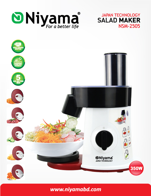 The Niyama Salad Maker NSM-2505 is a versatile kitchen appliance designed to simplify your meal preparation. Powered by a robust 350W 100% copper motor, it ensures reliable performance for all your culinary needs.